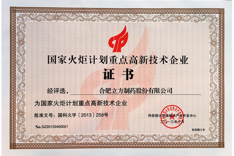 立方制藥 國家火炬計(jì)劃重點(diǎn)高新技術(shù)企業(yè)證...